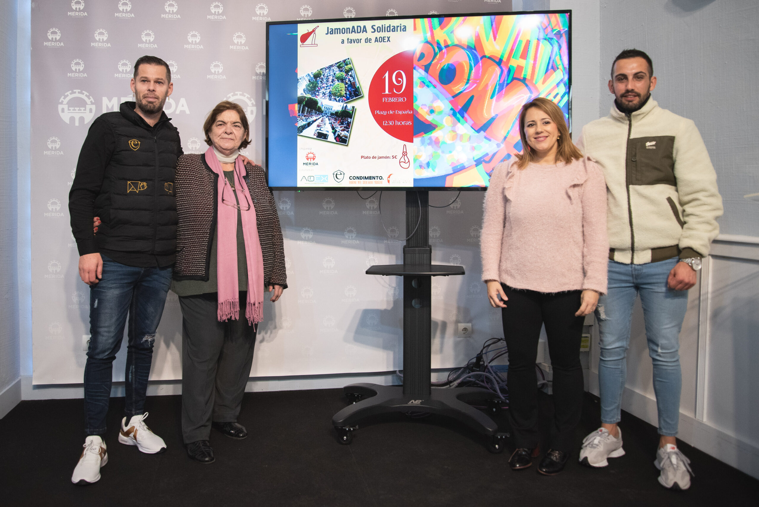 La delegada de Festejos, Ana Aragoneses, acompañada por el cortador de jamón, Ruben Mayoral y la delegada de AOEX en Mérida, Amalia Franco, ha presentado la JamonADA que organiza el embajador del ibérico, a través de cortadores solidarios, y cuyos beneficios irán destinados a AOEX Mérida.