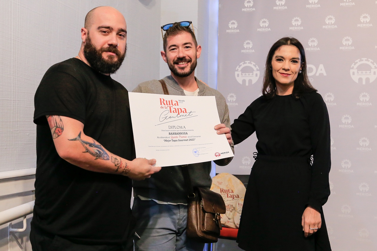 La delegada ha abierto el sobre con el fallo del jurado de la Ruta de la Tapa de Mérida 2022 de “La Mejor Tapa Gourmet de Mérida 2022” y ha procedido a la entrega de diploma y premio de los 5 primeros clasificados que han sido: