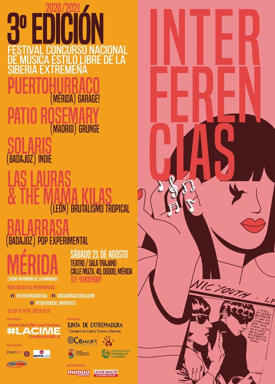 El sábado 21 de agosto se celebra, en la Sala Trajano, la tercera edición de los premios de INTERFERENCIAS Festival Concurso Nacional de Música de La Siberia Extremeña de estilo libre en el que participarán los premiados: PuertoHurraco (Mérida), Patio RoseMary (Madrid), Solaris (Badajoz), Las Lauras & The Mamas Kilas (León) y Balarrasa (Badajoz). Organiza la Asociación Cultural LaCime de Garbayuela.