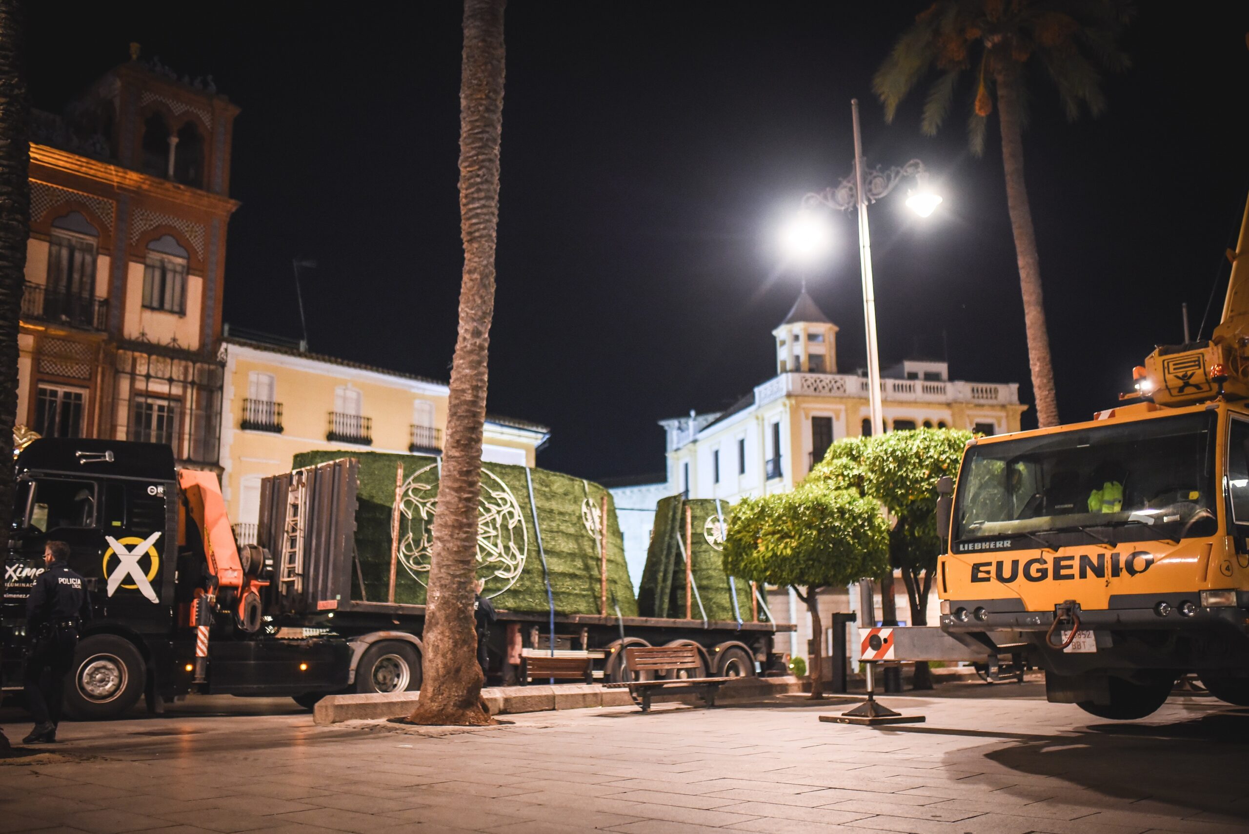Operarios de la empresa Ximenez, adjudicataria de la iluminación artística de Navidad, comenzaron en la noche de ayer con el montaje de los motivos que iluminarán y decorarán las calles de Mérida durante la Navidad 2021-2022.