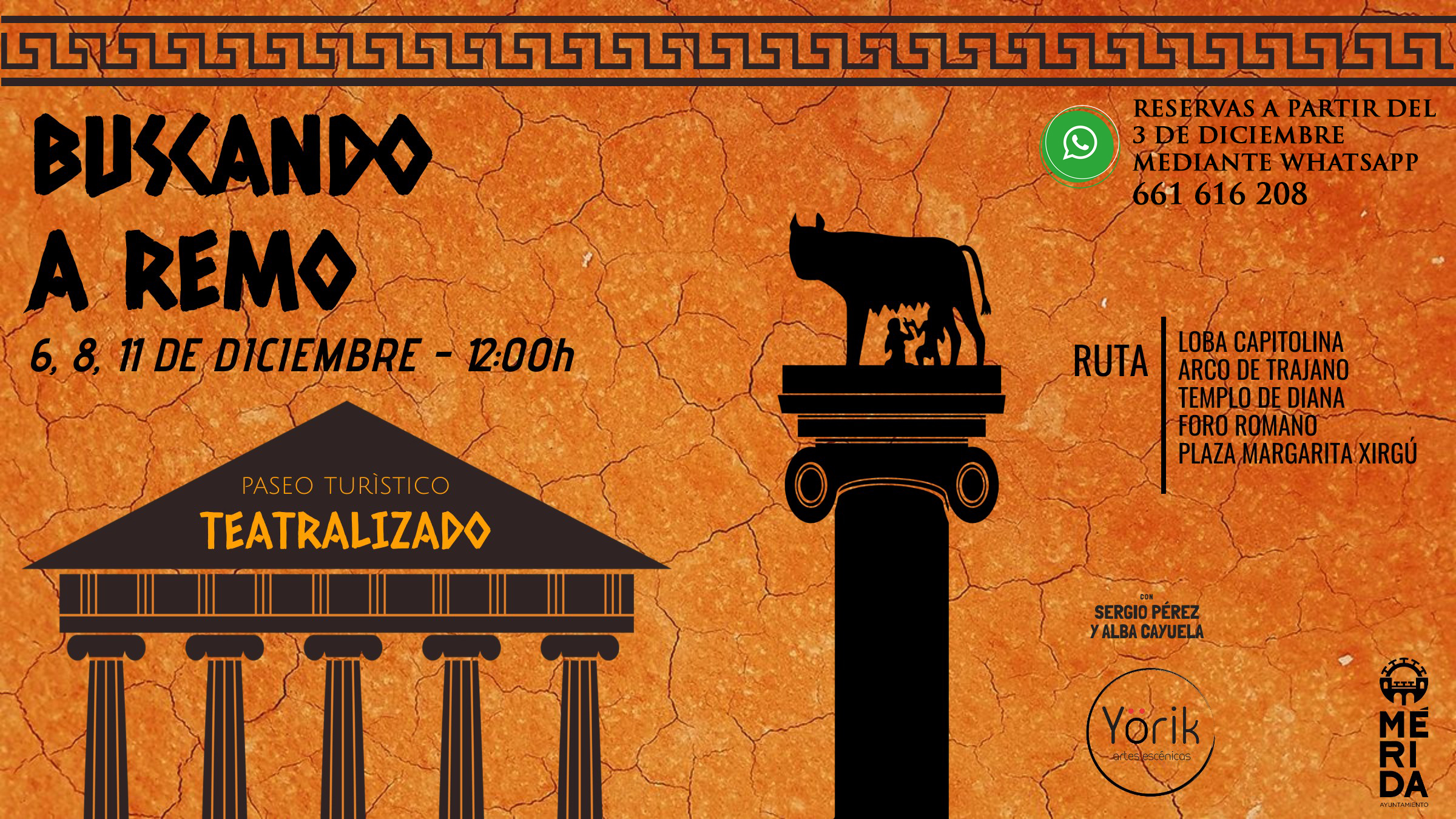 Los días 6, 8 y 11 de diciembre, a las 12:00 horas, se han organizado visitas teatralizadas ‘Buscando a Remo’, a cargo de YORIK Artes Escénicas, en el que dos actores nos invitan a un paseo turístico teatralizado cuyo itinerario tendrá su salida en la Loba Capitolina para después pasar cerca del Arco Trajano, Templo de Diana, Foro Romano con llegada en Plaza Margarita Xirgu con una duración aproximada de hora y media.