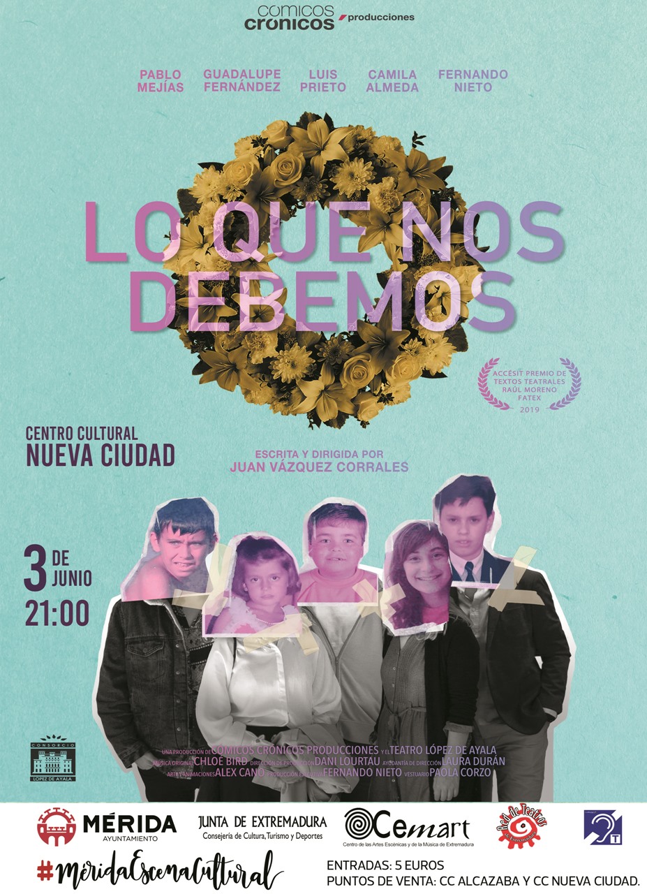 Lo que nos debemos, de Juan Vázquez Corrales, habla sobre el irremediable paso a la edad adulta, la amistad, la soledad, el devenir del tiempo; y rinde un sincero homenaje a la figura de los maestros de escuela. Se representará el viernes 3 de junio en el Centro Cultural de Nueva Ciudad a las 21 horas.