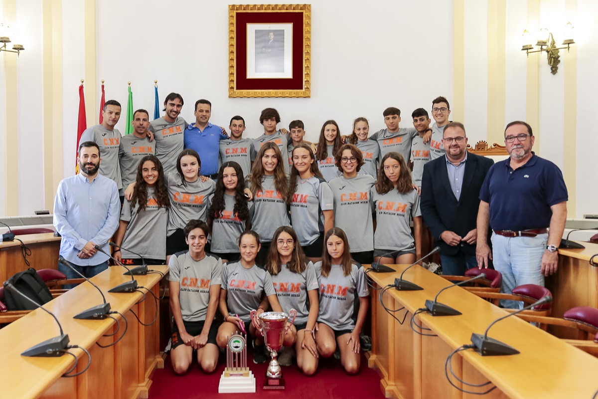 El Alcalde, Antonio Rodríguez osuna, ha recibido hoy en el Salón de Plenos a los deportistas y directiva del Club Natación Mérida que se proclamó el pasado fin de semana Campeón de Extremadura Absoluto en un acto en el que han estado presentes el Presidente de la Federación Extremeña de Natación, José Antonio Amaya, y el delegado de deportes, Felipe González.