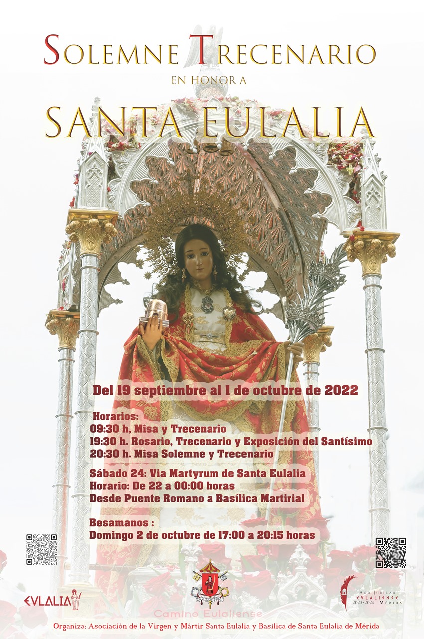 La basílica de Santa Eulalia acoge desde hoy lunes la celebración del Trecenario en honor a la Mártir Santa Eulalia que se prolongará hasta el 1 de octubre con tres celebraciones diaria a las 9,30 horas, a las 19,30 horas y a las 20,30 horas, siendo en ésta última en la que intervendrá cada día, un sacerdote invitado por la parroquia de Santa Eulalia. El domingo 2 de octubre, de 17 a 20,15 horas, se celebrará el besamanos a la Patrona.