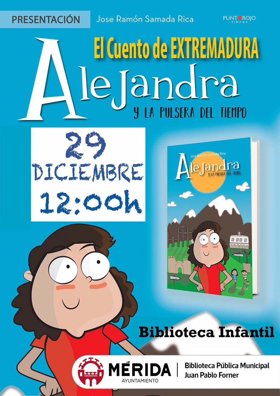 El autor José Ramón Samada presentará su libro infantil ‘Alejandra y la pulsera del tiempo’ en la Sección Infantil de la Biblioteca Municipal Juan Pablo Forner el jueves 29 de diciembre, a las 12:00 horas.