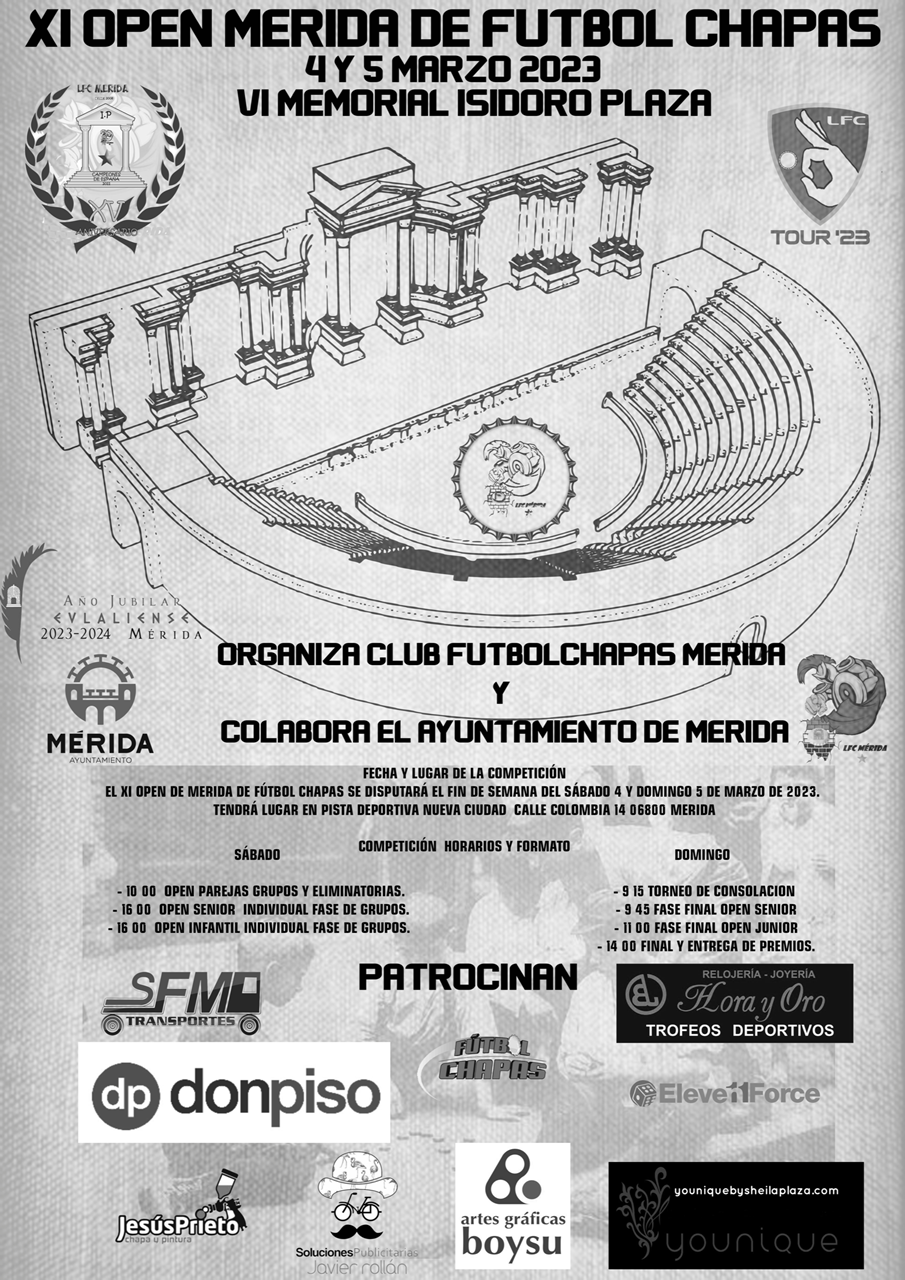 El pabellón polideportivo de Nueva Ciudad acoge este fin de semana el XI Open Ciudad de Mérida de Fútbol Chapas organizado por el Club de Fútbol Chapas de Mérida. El sábado por la mañana se celebrará el Open de parejas, modalidad de partidos dobles , fase de grupos y final, el sábado por la tarde, será el turno de fase de grupos tanto junior, con 16 participantes aproximadamente, como senior, con 60 participantes aproximadamente. Ya el domingo será la fase final de eliminatorias tanto senior como junior.
