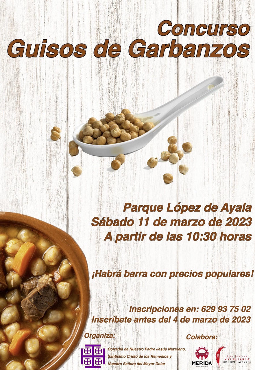 El sábado 11 de marzo, a partir de las 10:30 horas, el Parque López de Ayala acoge un Concurso de Guisos de Garbanzos organizado por la Cofradía de Nuestro Padre Jesús Nazareno. Habrá barra con precios populares.
