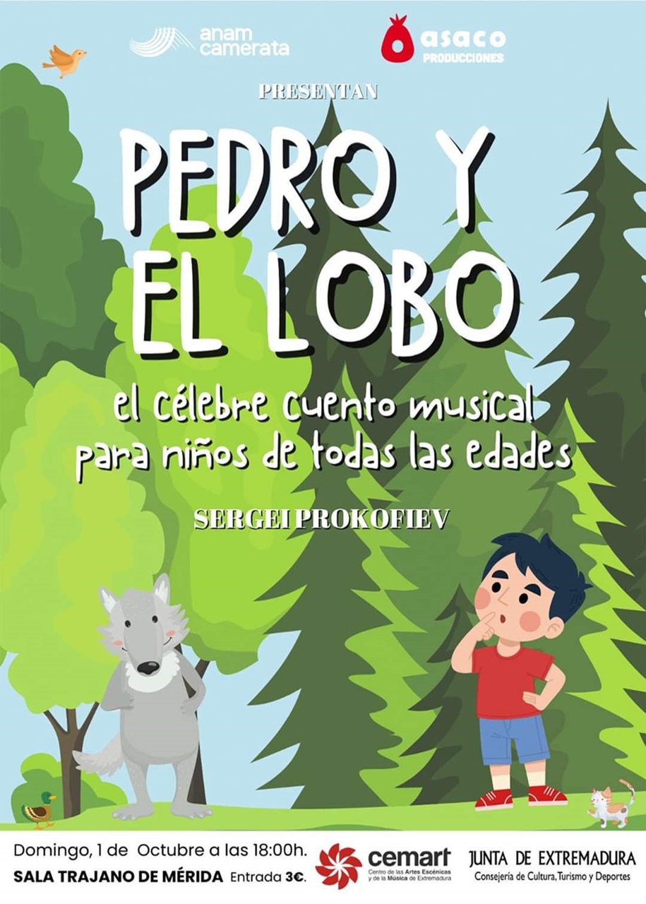 La joven agrupación sinfónica extremeña ‘Anam Camerata’ nos ofrecerá su versión de “Pedro y el Lobo, de S. Prokofiev. El cuento musical más famoso de todos los tiempos narra las peripecias del intrépido Pedro, que, con la ayuda de un gato, un pájaro y un pato, intentan atrapar a un lobo. Está escrita de forma que cada personaje de la historia tiene asignado un instrumento y un tema musical: Pedro (instrumentos de cuerda: violín, violas, violonchelos y contrabajo), su Abuelo (el fagot), el Pájaro (la flauta traversa), el Pato o Ganso (el oboe), el Gato (el clarinete), El Lobo (3 cornos) y los Cazadores (timbales y el bombo). Una producción de Asaco Producciones