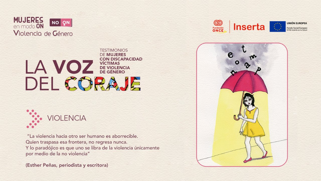 ‘La voz del coraje’ es un libro en él se recogen catorce testimonios de mujeres con discapacidad víctimas de violencia de género. Catorce mujeres que han sido capaces de retomar las riendas de su vida, a las que Inserta Empleo de la Fundación ONCE ha acompañado para apuntalar su autoestima, ofrecerles la formación necesaria para encontrar un empleo e incluso buscárselo. Ellas mismas cuentan su historia, dando ejemplo de que es posible salir de una situación así, al tiempo que exhortan a toda la sociedad a no mirar para otro lado, a denunciar la violencia, a apoyar a las víctimas.