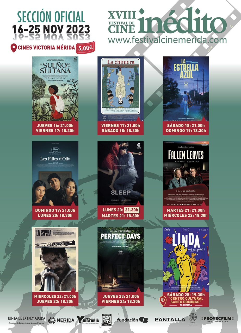 • Las películas que componen la Sección Oficial son: las españolas El sueño de la Sultana, La estrella azul y La espera, la italiana La chimera, la tunecina Les filles d’olfa, la coreana Sleep, la finlandesa Fallen leaves y la japonesa Perfect days..