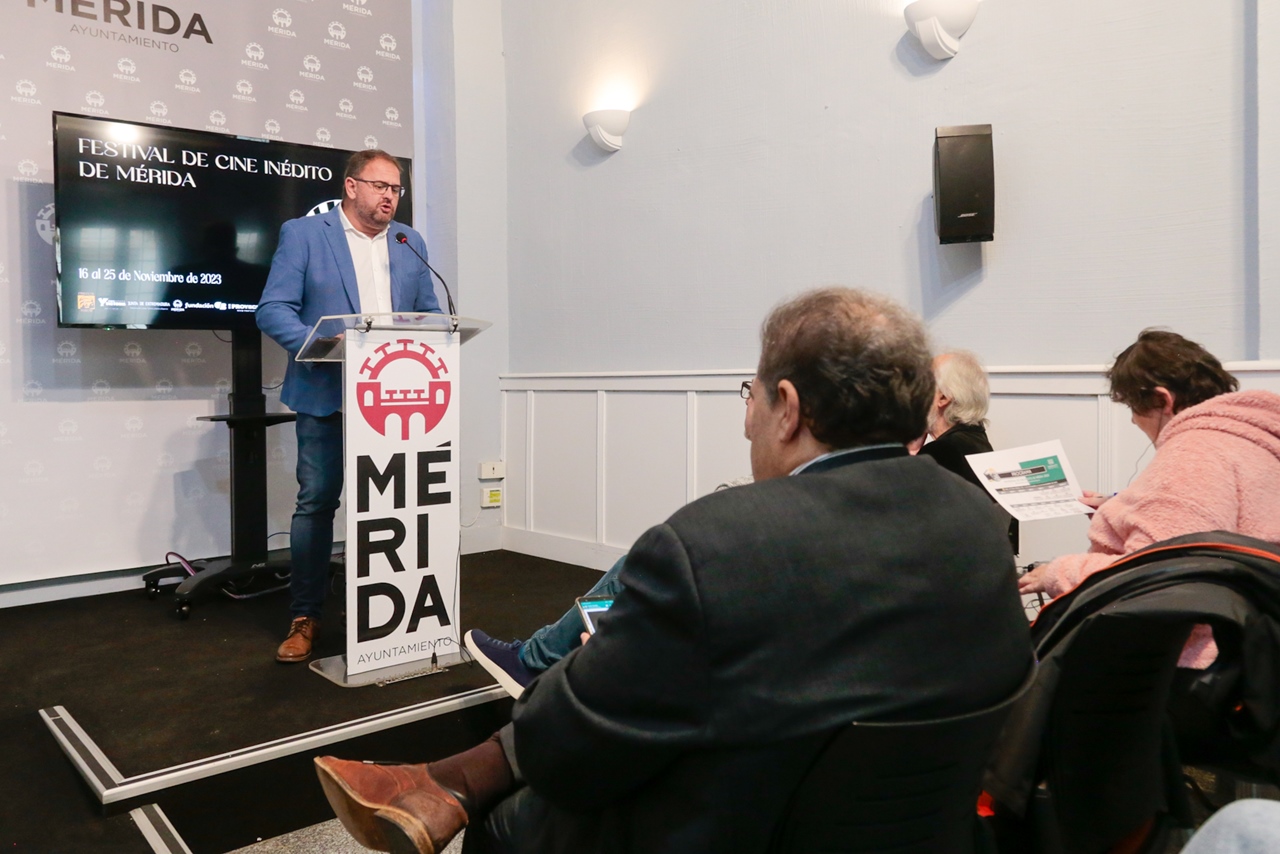 El alcalde, Antonio Rodríguez Osuna, el director de la Filmoteca de Extremadura, Antonio Gil Aparicio, el director del Festival, Ángel Briz Hernández, y el director de Programación, David Garrido Bazán han presentado esta mañana la XVIII edición del Festival de Cine Inédito de Mérida, que se celebrará del 16 al 25 de noviembre, y que incluirá un total de 10 películas, ocho a concurso de seis nacionalidades distintas, una sorpresa y otra de clausura.