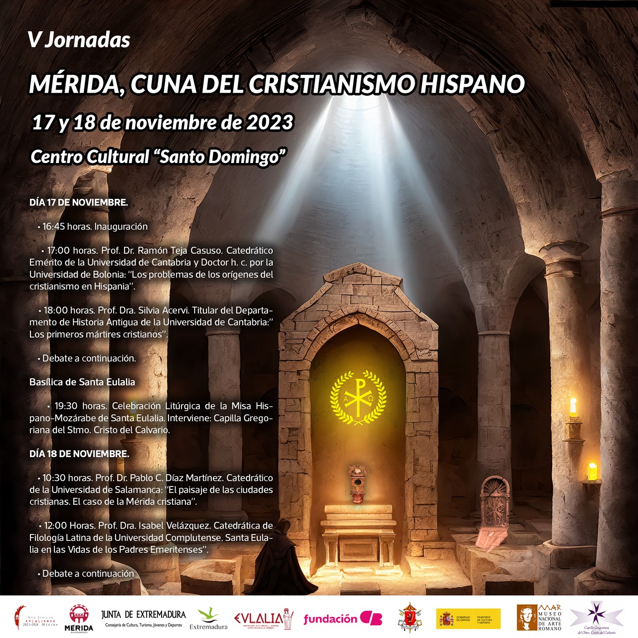 Los días 17 y 18 de noviembre se celebrarán en el Centro Cultural de Santo Domingo las V jornadas ‘Mérida, cuna del cristianismo hispano’ en donde se analizarán y pondrán sobre la mesa cuestiones relativas a la figura de Santa Eulalia y a la de la propia ciudad como referente en el mundo cristiano de nuestro país. Entrada gratuita.