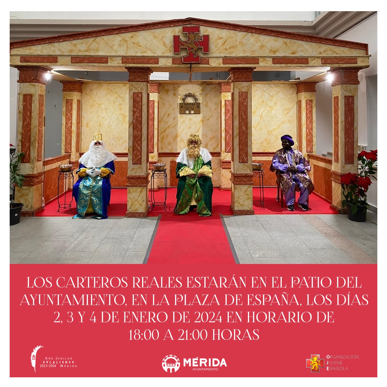 Los carteros reales estarán en el Patio del Ayuntamiento, en la Plaza de España, los días 2, 3 y 4 de enero de 2024 en horario de 18:00 a 21:00 horas. Colabora OJE Mérida