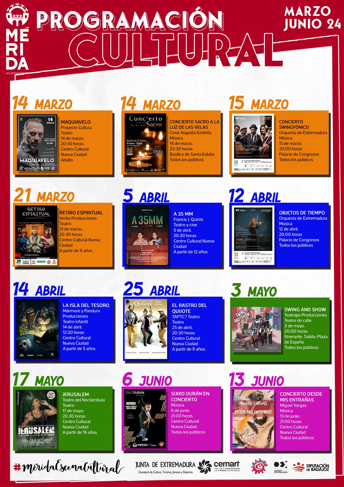Ya el viernes, 15 de marzo, tendrá lugar el Concierto Swinfónico de la Orquesta de Extremadura, a las 20 horas, en el Palacio de Congresos. También en el mes de marzo, otra compañía emeritense, Verbo Producciones, representará la comedia Retiro Espiritual, el jueves 21 de marzo, en el Centro Cultural de Nueva Ciudad, a las 20.30 horas.