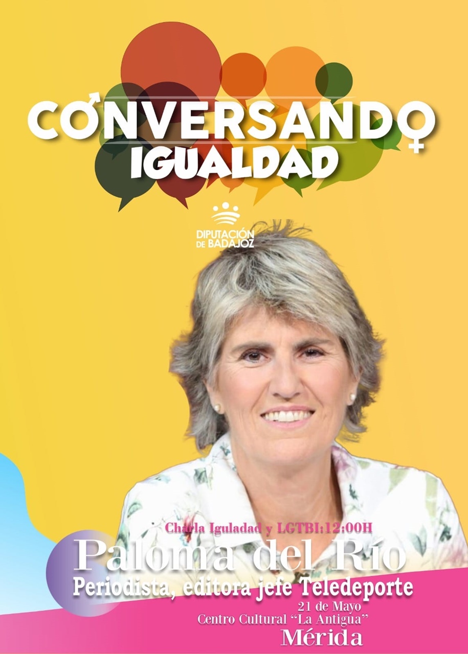 La periodista Paloma del Río ofrecerá la charla ‘Conversando Igualdad’ en el Centro Cultural de La Antigua, el 21 de mayo, a las 12:00 horas, en donde la editora jefe de Teledeporte hablará sobre Igualdad y LGTBI. La educación, la formación y la concienciación en Igualdad y Diversidad son instrumentos fundamentales para llegar a una sociedad más justa e igualitaria, la sociedad que nos merecemos, donde tengamos nuestro espacio de libertad y respeto. Entrada libre. Organiza Diputación de Badajoz