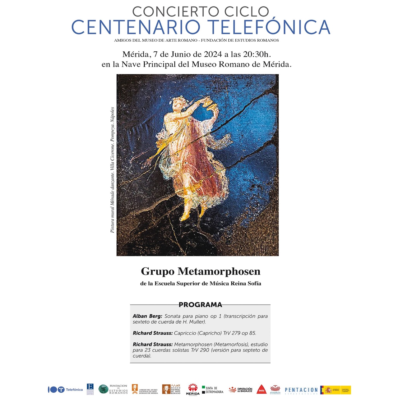 La Asociación de Amigos del Museo de Arte Romano y la Fundación de Estudios Romanos organizan el 7 de junio, a las 20:30 horas, el concierto de primavera que coincide con el Ciclo Centenario de Telefónica. Será en la Nave Principal del Museo con entrada libre hasta completar aforo. El concierto será ofrecido por el grupo Metamorphosen de la Escuela Superior de Música Reina Sofía que interpretarán piezas de Alban Berg y Richard Strauss