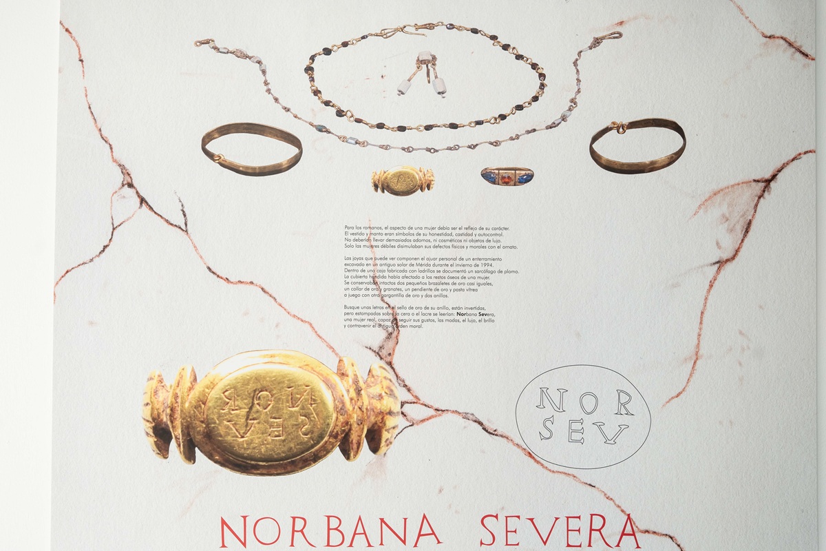 Norbana Severa, de cincuenta años de edad, a la que su hija dedicó un enterramiento. Se conoce su nombre y a su persona por las evidencias arqueológicas aparecidas. En su tumba se encontró su sello y joyas de oro. Una mujer de gran poder económico en la ciudad. Procedente de una zona minera de la actual Portugal, una zona minera rica en oro, “de ahí se justifica el depósito de este material encontrado en su enterramiento y el que esta señora tuviera su sello; es de los pocos sellos femeninos que existen” señala Juana Márquez, arqueóloga del Consorcio de la Ciudad Monumental y comisaria de la muestra.