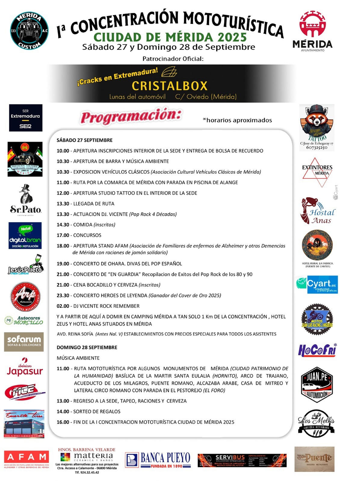 La asociación cultural Mérida Custom organiza la 1ª Concentración Mototurística Ciudad de Mérida 2025 los días 27 y 28 de septiembre cargada de actividades que incluyen rutas turísticas, concursos, música, exposición de vehículos clásicos, stands solidarios, etc