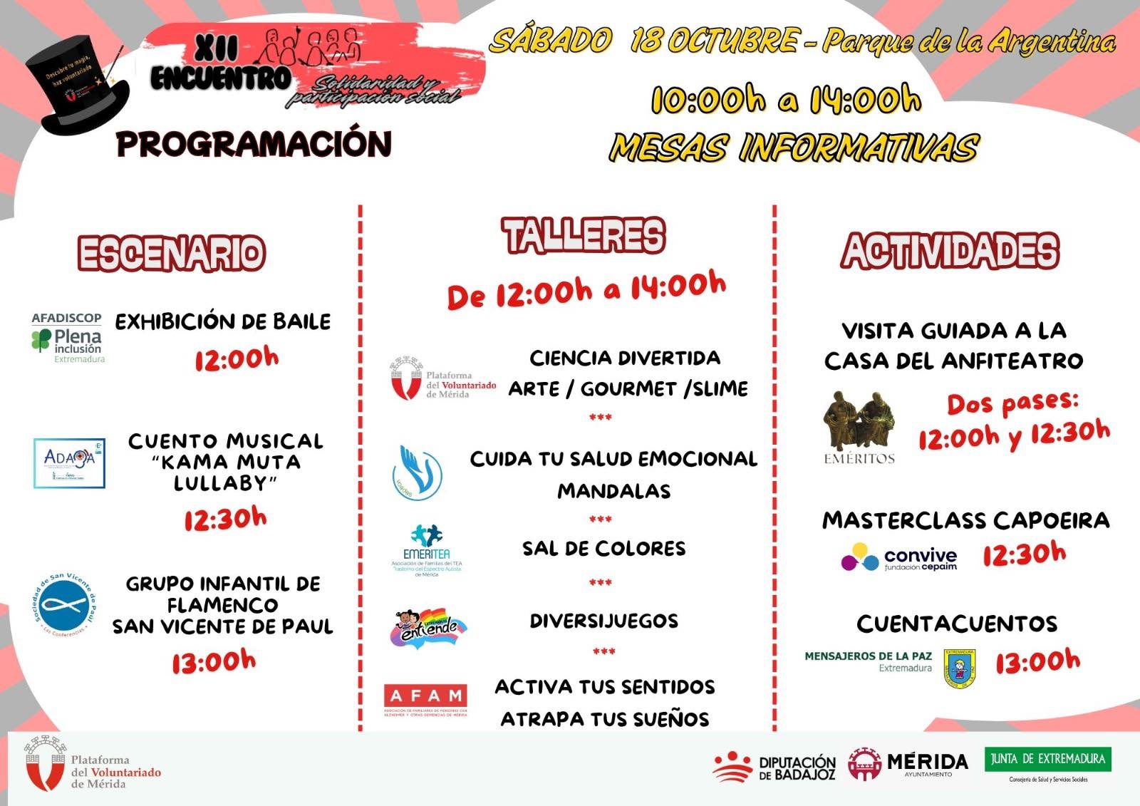 El sábado 18 de octubre, de 10:00h a 14:00 horas, el Parque de la Argentina acoge la XXII Encuentro para la Solidaridad y Participación Social con la presencia de numerosas entidades de la Plataforma del Voluntariado de Mérida con el objetivo de consolidar el tejido asociativo en la localidad y crear espacio para el intercambio de información, experiencias y trabajo conjunto. Habrá numerosas actividades y talleres durante toda la mañana.