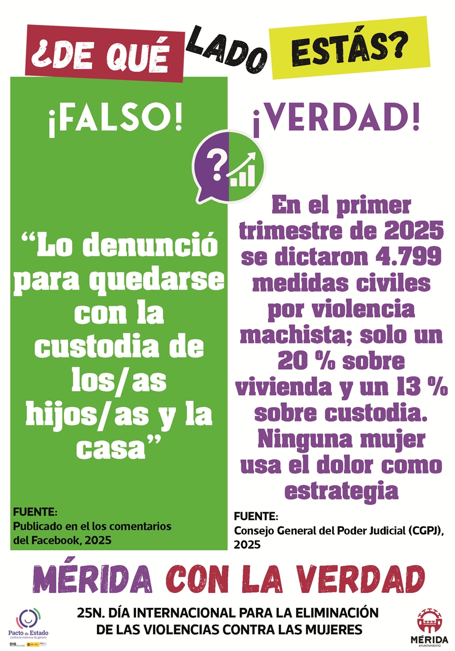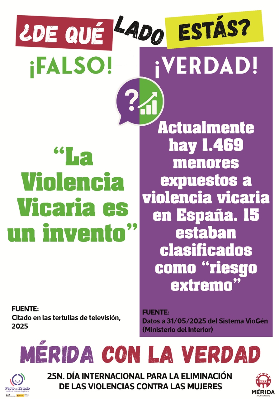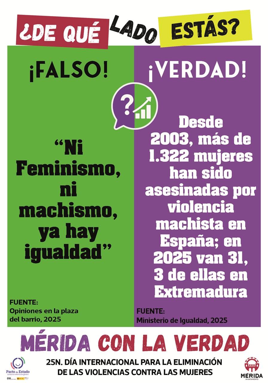 Para este año 2025, la campaña que pone en marcha el ayuntamiento ‘Mérida con la verdad. ¿De qué lado estás?’ plantea una reflexión a la ciudadanía para evidenciar a quienes a través de afirmaciones de fuentes no oficiales trivializan el dolor de las mujeres, desacreditan a quienes trabajan con las víctimas y faltan al respeto a las mujeres asesinadas. Una cuestión que es inaceptable, profundamente peligroso y claramente falso.