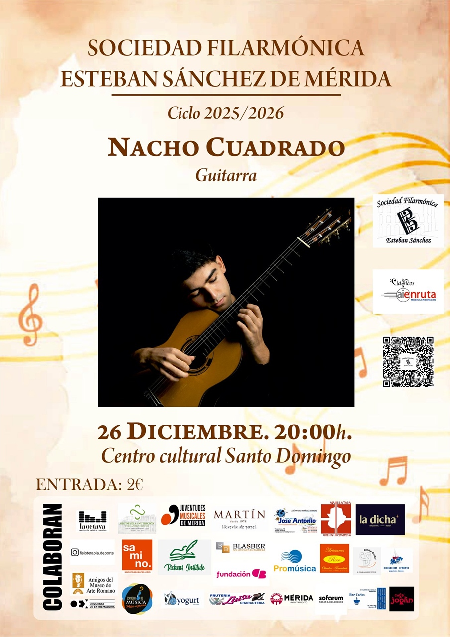 El viernes, 26 de diciembre, a las 20:00 horas, el Auditorio del Centro Cultural Santo Domingo de la Fundación CB acogerá un nuevo concierto de la Sociedad Filarmónica Esteba Sánchez a cargo del músico emeritense Nacho Cuadrado (guitarra), quien interpretará obras de Luigi Legnani, Giulio Regondi, Franz Schubert o Joaquín Turina, entre otros. Entrada: 2€