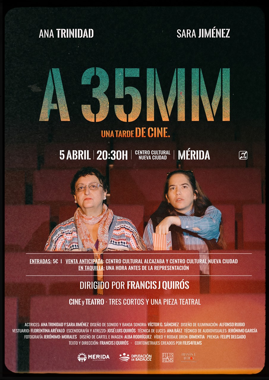A 35 mm. Una tarde de cine es la nueva creación teatral y cinematográfica del actor, productor, director, clown, cineasta y dibujante Francis J. Quirós. “Es la historia de un reencuentro entre una madre y una hija que entran a una sala de cine casi como dos desconocidas y que salen de ella necesitándose; es una experiencia cinematográfica y teatral, un homenaje al cine y a las madres conformado por tres cortometrajes y una pieza teatral creada para el público curioso vestida con música creada para esta creación única” señala Francisco J. Quirós.