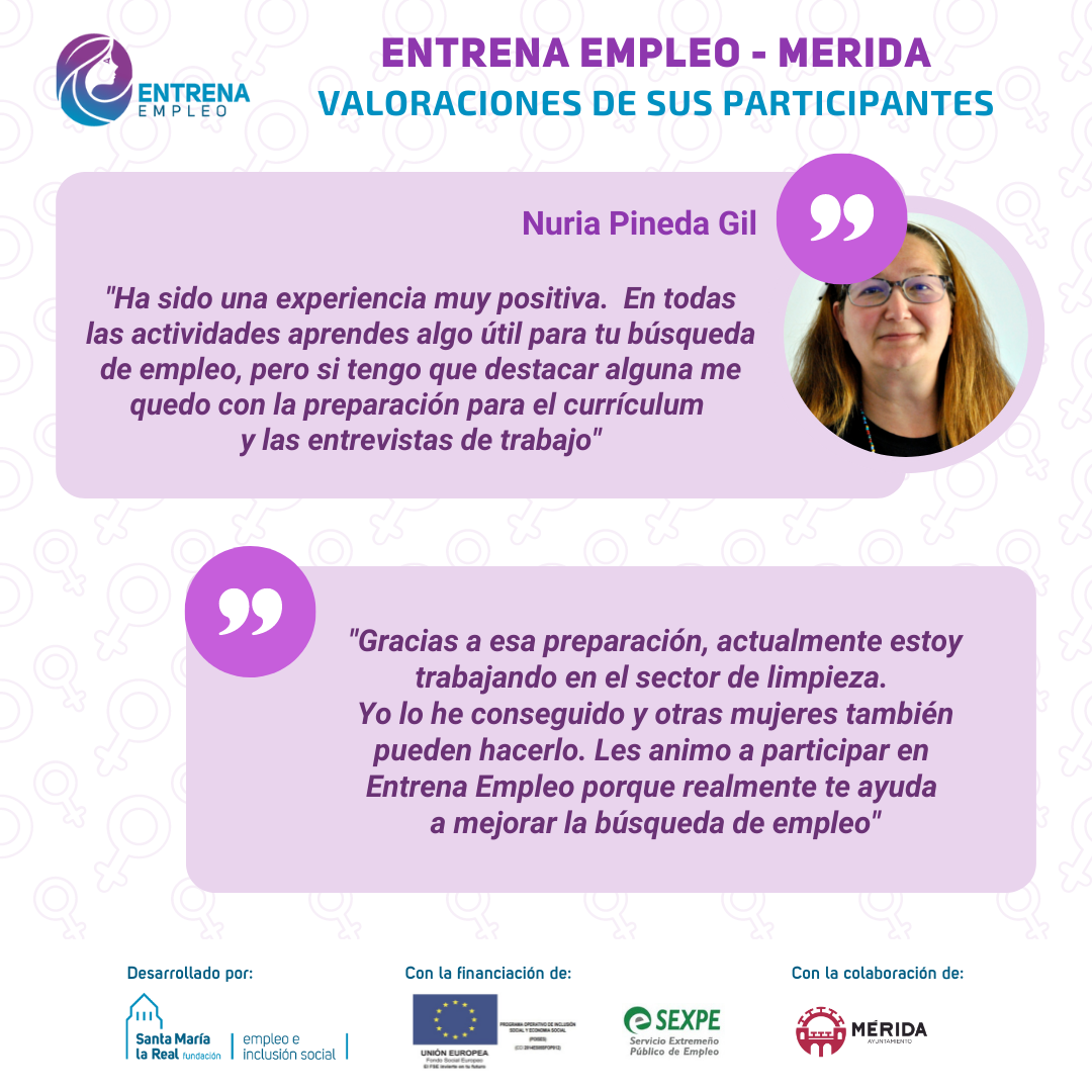 El segundo proyecto piloto de Entrena Empleo Mérida se llevará a cabo entre finales de septiembre y finales de noviembre. Las mujeres participantes acudirán tres días a la semana a sesiones presenciales y virtuales para reactivar su búsqueda de empleo. Contarán con el asesoramiento de especialistas para realizar un nuevo itinerario de búsqueda de empleo y enfocar su objetivo profesional; actualizar su currículum; reforzar competencias transversales y habilidades digitales para el empleo; ensayar entrevistas para ganar confianza y seguridad en los procesos de selección; elaborar mapas de empleabilidad y realizar visitas a empresas en busca de su inserción.