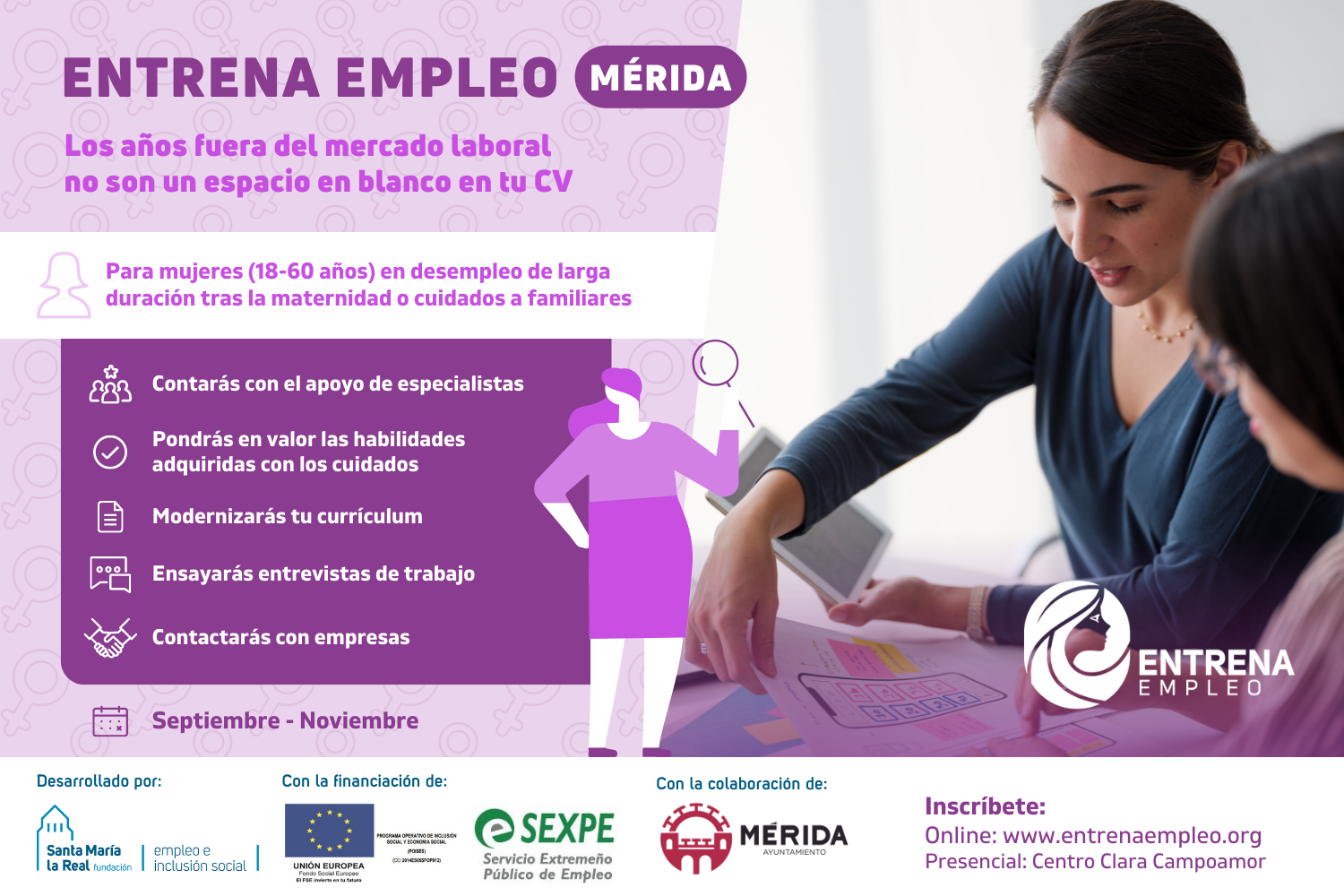 Mérida acogerá a finales de septiembre el segundo proyecto piloto de “Entrena Empleo”, creado por Fundación Santa María la Real para mejorar la empleabilidad de mujeres de diferentes edades (18-60 años), diferentes niveles formativos y trayectorias profesionales que se encuentran en desempleo de larga duración tras la maternidad o dedicarse al cuidado de familiares, generalmente ascendientes y dependientes.