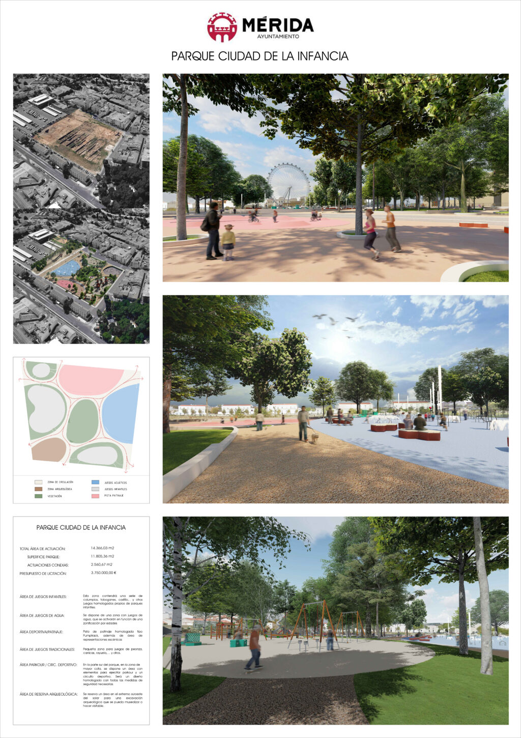 - El proyecto prevé actuaciones de mejora en las calles perimetrales (Pontezuelas, López Puigcervet y Teniente Flomesta) adecuando y renovando la urbanización de las mismas. La Ciudad de la Infancia además de los usos propios de paseo, descanso y esparcimiento, áreas arboladas y de sombra, viene a completar y ampliar la oferta de jardines de Mérida.