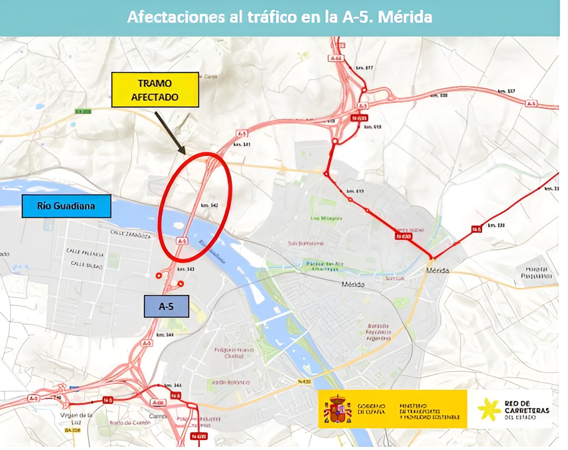 El Ministerio de Transportes y Movilidad Sostenible está ejecutando las obras de sustitución de las juntas de dilatación de los viaductos sobre el río Guadiana situados en el kilómetro 342,5 de la A-5 en Mérida, en la provincia de Badajoz. La obra en su totalidad cuenta con un presupuesto vigente de 1,415 millones de euros (IVA incluido).