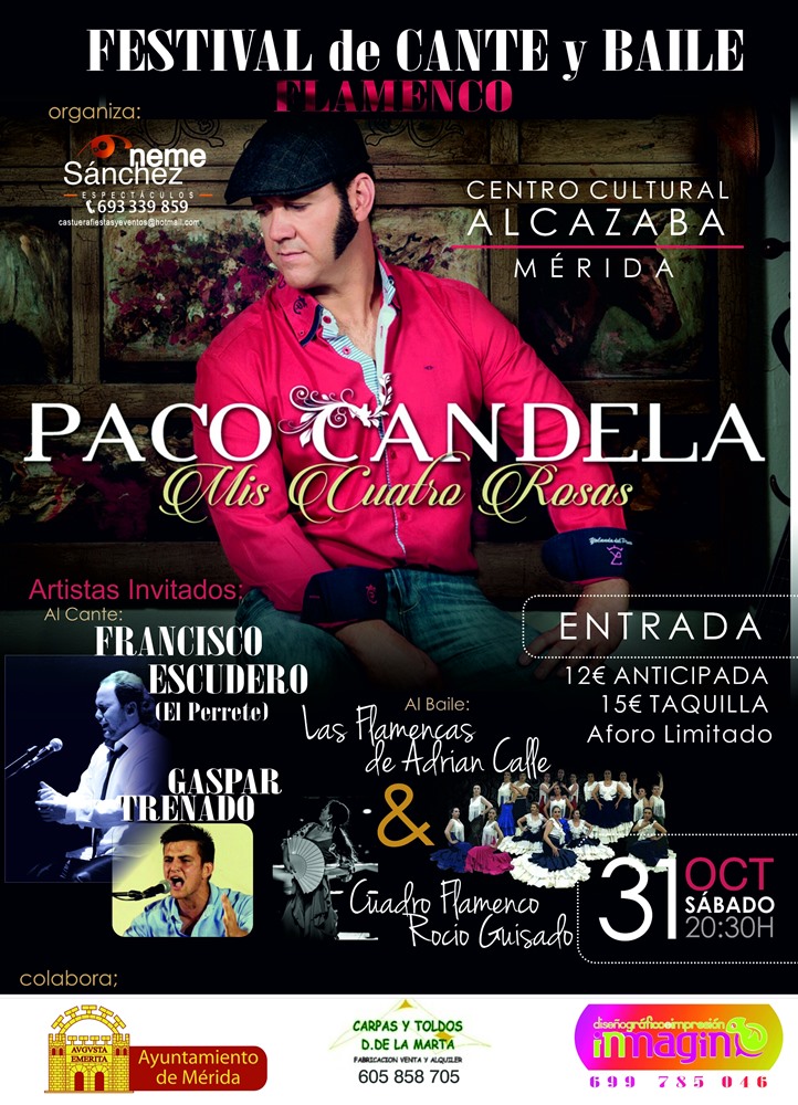 El próximo 31 de octubre tendrá lugar en el Centro Cultural Alcazaba «FESTIVAL DE CANTE Y BAILE FLAMENCO» con Paco Candela, Paco “ El Perrete” y Gaspar Trenado al cante y las flamencas de “Adrián Calle” y el cuadro flamenco de “Rocio Guisado” al baile, organizado por “Neme Sanchez espectáculos” y en colaboración con el Ayuntamiento de Mérida.