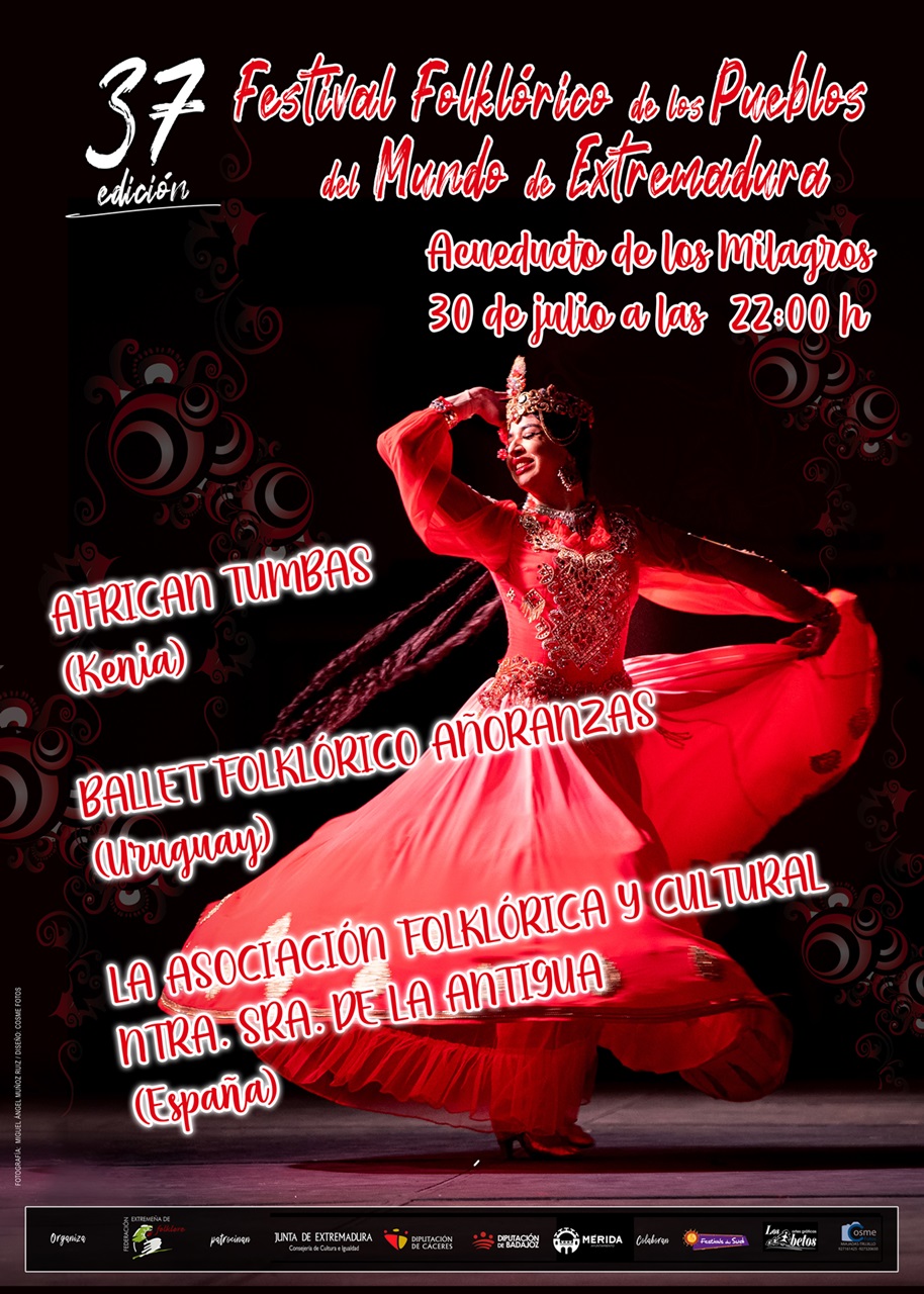 Con motivo de la celebración de la 37ª Edición del Festival Folklórico de los Pueblos del Mundo de Extremadura, Mérida como una de sus sedes permanentes, acogerá varias actuaciones en el Acueducto de los Milagros, el día 30 de julio a las 22 horas. En esta cita intervendrán los grupos ‘African Tumbas’, de Kenia, ‘Ballet Folklórico Añoranzas’, de Uruguay, y la Asociación Folklórica y Cultural Nuestra Señora de La Antigua de Mérida.