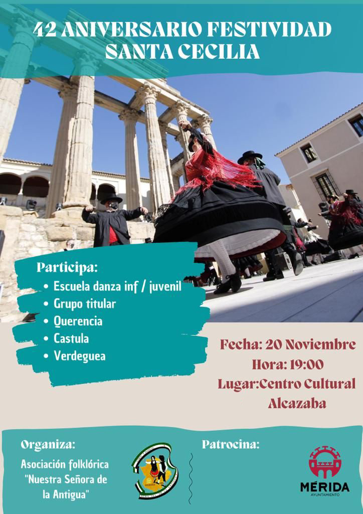 El domingo 20 de noviembre, el Centro Cultural Alcazaba acoge la celebración del 42 aniversario de la Festividad de Santa Cecilia con la participación de los diferentes grupos de danza de la Asociación Folklórica Nuestra Señora de La Antigua. A partir de las 19:00 horas, con entrada libre.