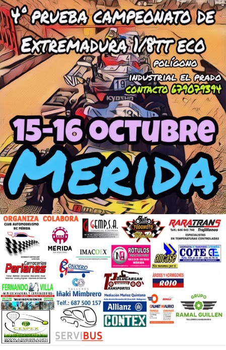 El Circuito Municipal de Radio Control acoge, los días 15 y 16 de octubre, la 4ª Prueba Campeonato de Extremadura Coches RC. El sábado 15 son los entrenamientos y el domingo 16 la competición en horario de 9:00 a 14:00 horas. Organiza Club Automodelismo RC Mérida