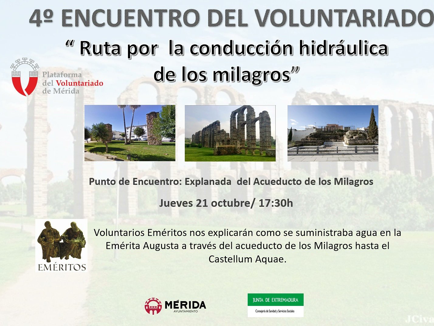 El 21 de octubre, los Voluntarios Eméritos realizarán una ruta por la conducción hidráulica de los Milagros y nos contarán cómo se suministraba agua en la Emérita Augusta. La ruta se iniciará a las 17:30 desde la explanada del Acueducto de Los Milagros.