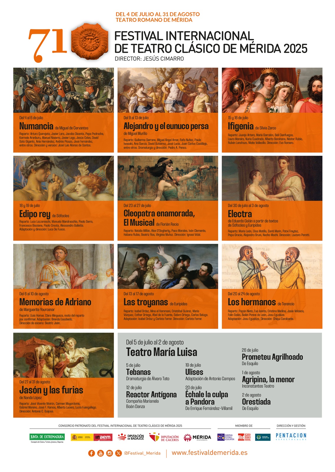 Entre el 4 de julio y el 31 de agosto de 2025 tendrá lugar la 71 edición del Festival Internacional de Teatro Clásico de Mérida que acogerá 10 espectáculos (7 estrenos) en el Teatro Romano y en el que volverá a repetir el Teatro María Luisa como extensión donde se podrá disfrutar de otros 7 espectáculos.