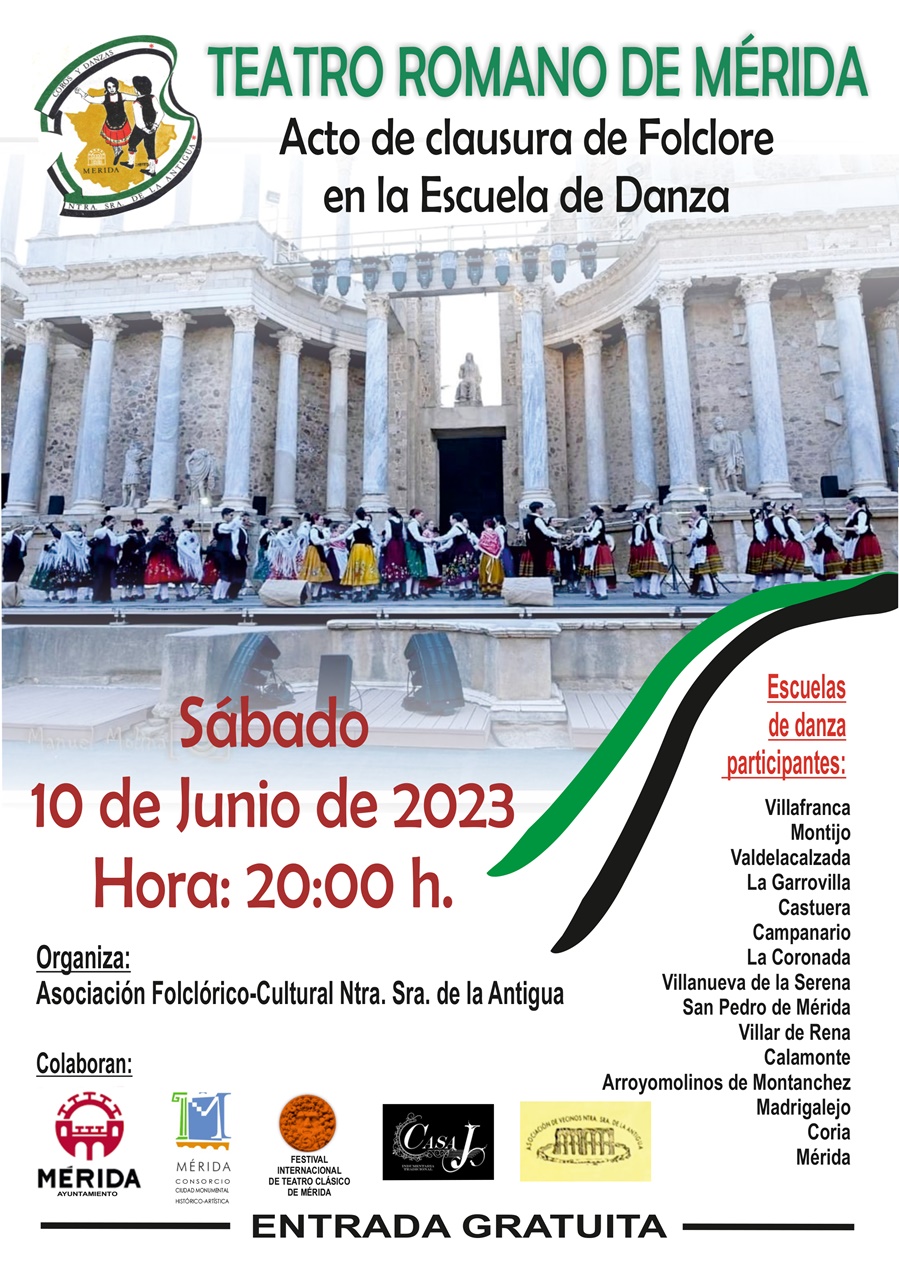 El Teatro Romano acoge, el sábado 10 de junio, a partir de las 20:00 horas, un espectáculo de danza en el que participarán unos 400 niños y niñas que han disfrutado durante todo el año del aprendizaje del folclore a través de las diferentes clases que han impartido los profesores y monitores de distintas escuelas de Extremadura. Entrada libre. Organiza la Asociación Folklórico-Cultural Ntra. Sra. de la Antigua