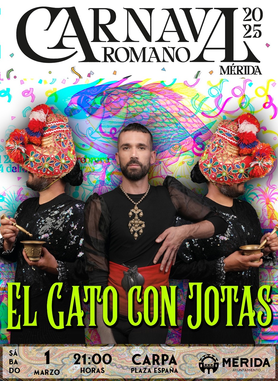 El sábado 1 de marzo, a partir de las 21:00 horas, la Carpa de la Plaza de España acoge la actuación musical de ‘El Gato con Jotas’ dentro de las actividades del Carnaval Romano 2025. Entrada libre.