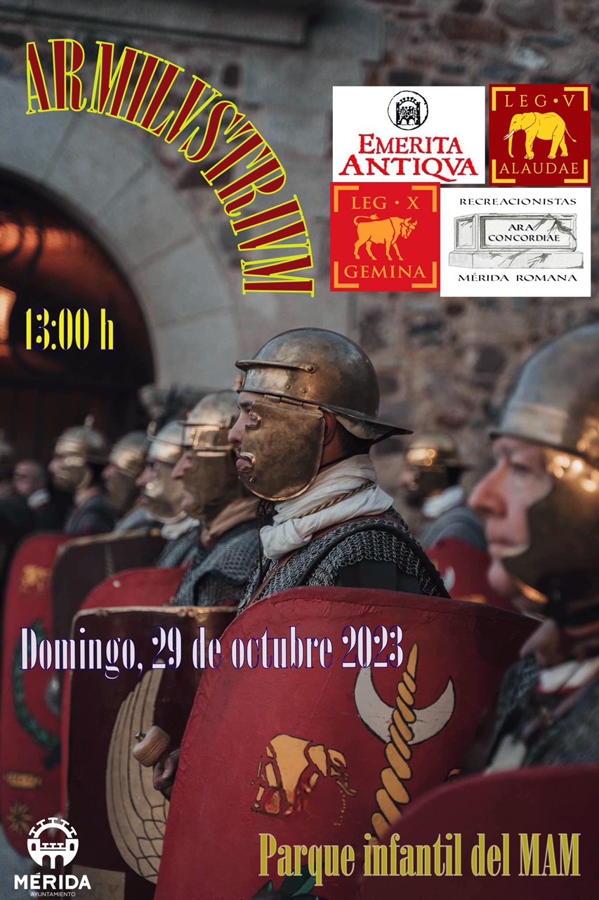 La Asociación Cultural Emerita Antiqua y la Asociación de recración romana Ara Concordiae recreararán el Armilvstrivm 2023 en el parque infantil junto al Museo Abierto de Mérida MAM, el sábado 29 de octubre, a partir de las 13:00 horas.