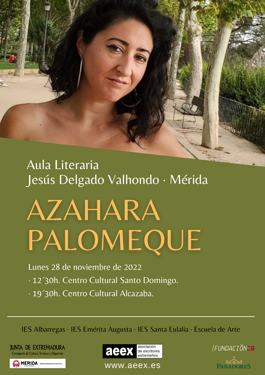 El lunes 28 de noviembre, el Aula Literaria Jesús Delgado Valhondo de la Asociación de Escritores Extremeños organiza un encuentro literario con la escritora pacense Azahara Palomeque en sesión matinal, a las 12:30 horas, para los centros educativos de Mérida en el Centro Cultural Santo Domingo de la Fundación CB y en sesión de tarde, a las 19:30 horas, para todos los públicos en la Biblioteca Municipal Juan Pablo Forner de Mérida.
