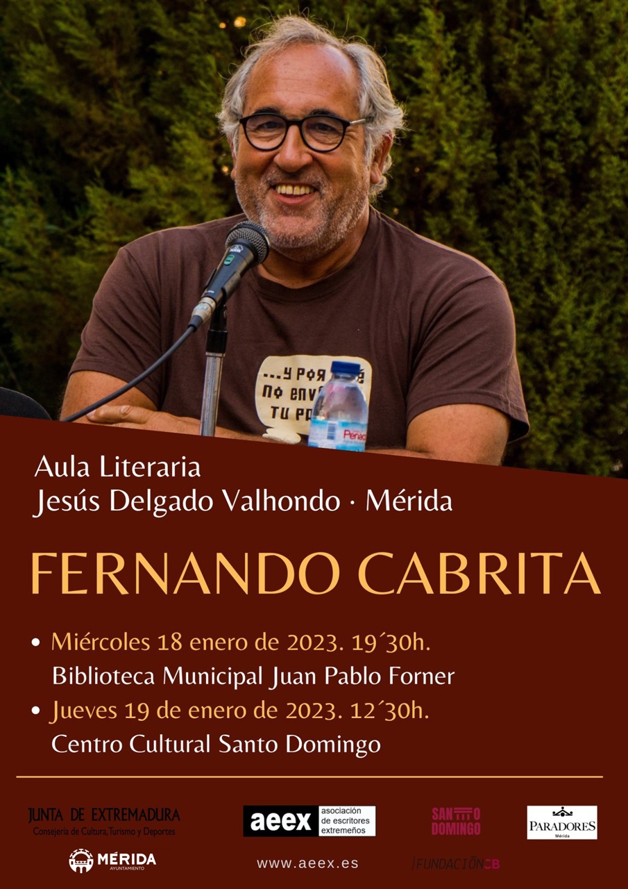 El miércoles 18 y el jueves 19 de enero, el Aula Literaria Jesús Delgado Valhondo de la Asociación de Escritores Extremeños organiza un encuentro literario con el escritor Fernando Cabrita en la Biblioteca Municipal Juan Pablo Forner (para todos los públicos) y el Centro Cultural Santo Domingo de la Fundación CB (centros educativos), respectivamente.