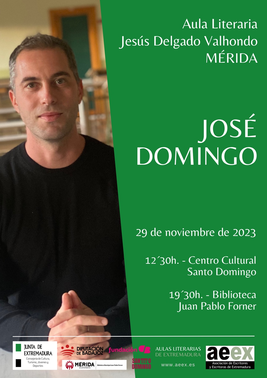 El miércoles 29 de noviembre, el Aula Literaria Jesús Delgado Valhondo de la Asociación de Escritores Extremeños organiza un encuentro literario con el escritor José Domingo, en la Biblioteca Municipal Juan Pablo Forner (para todos los públicos por la tarde) y el Centro Cultural Santo Domingo de la Fundación CB (centros educativos por la mañana), respectivamente.