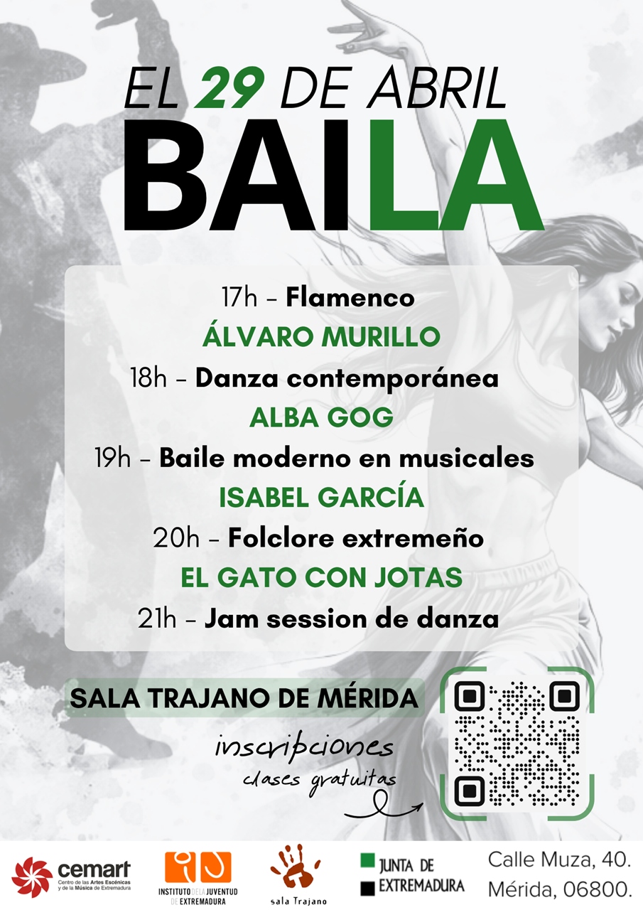 La cita tendrá lugar el 29 de abril, Día Internacional de la Danza, desde las 17:00 h hasta las 21:30 h, en la Sala Trajano de Mérida. Será un auténtico carrusel de clases y de baile que viajará desde el flamenco, la danza contemporánea, el baile moderno en musicales y el folclore extremeño, adaptadas a todo tipo de público. El objetivo es que cualquier persona que desee acercarse a la danza pueda hacerlo de forma sencilla, disfrutando, aprendiendo y, sobre todo, celebrando la danza: bailando y compartiendo. Los maestros especialistas que participan son: Álvaro Murillo, Alba Gog, Isabel García y El Gato con Jotas.