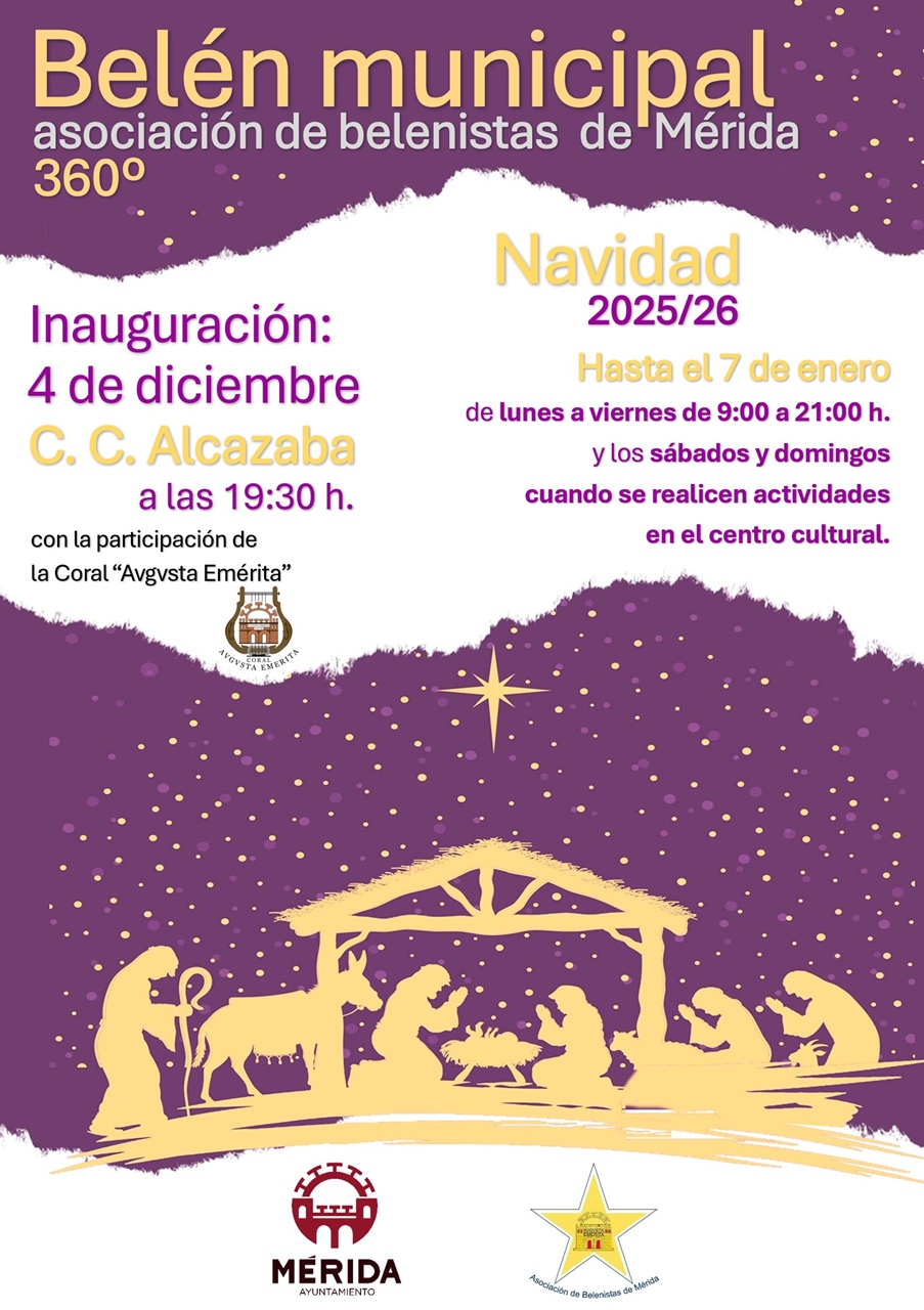 Desde el 4 de diciembre hasta el 7 de enero se podrá visitar el Belén Municipal ubicado en la rotonda central del Centro Cultural Alcazaba y que ha sido restaurado y montado por la Asociación Belenistas de Mérida.