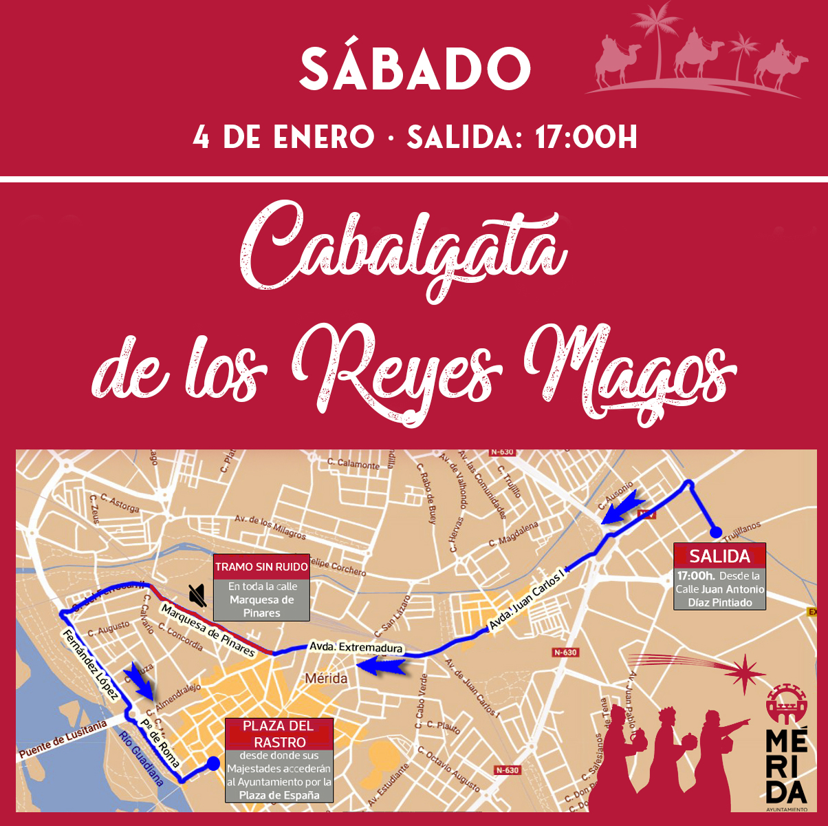 El recorrido será el siguiente: Salida desde Calle Juan Antonio Díaz Pintiado, Avenida Reina Sofía, Avda. Juan Carlos I, Avenida Extremadura, Calle Marquesa de Pinares, Calle del Ferrocarril, Avda. José Fernández López, Paseo de Roma, Calle Cava y Plaza del Rastro, desde donde sus Majestades accederán al Ayuntamiento por la Plaza de España, continuando el desfile por Plaza del Rastro y Calle Graciano. Durante el recorrido se establecerá un tramo sin ruido que deberán respetar todos los colectivos participantes, que será del de la calle Marquesa de Pinares desde la Rotonda de la Torre hasta haber pasado el Acueducto de Los Milagros.