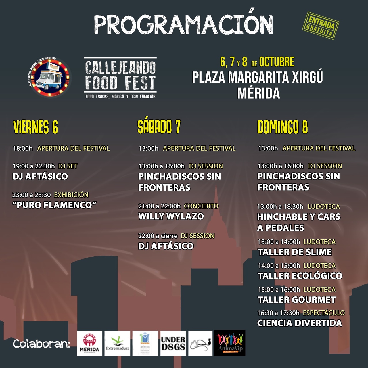 Del 6 al 8 de octubre se celebra, en el Parque de la Argentina, el festival Callejeando Food Fest Mérida 2023, un evento gastronómico y lúdico dedicado a la comida callejera de calidad y al ocio en el que una decena de food trucks de toda España ofrecerán al visitante una amplia variedad de productos y recetas. A lo largo del fin de semana se programarán una serie de actividades dirigidas a todos los públicos, como actuaciones musicales, exhibiciones, talleres y clases, zona infantil y, este año, con la novedad de una ludoteca. Los horarios serán el viernes, de 18:00 a 24:00 horas, el sábado de 13:00 a 24:00 y el domingo de 13:00 a 22:00 horas, ininterrumpidamente.