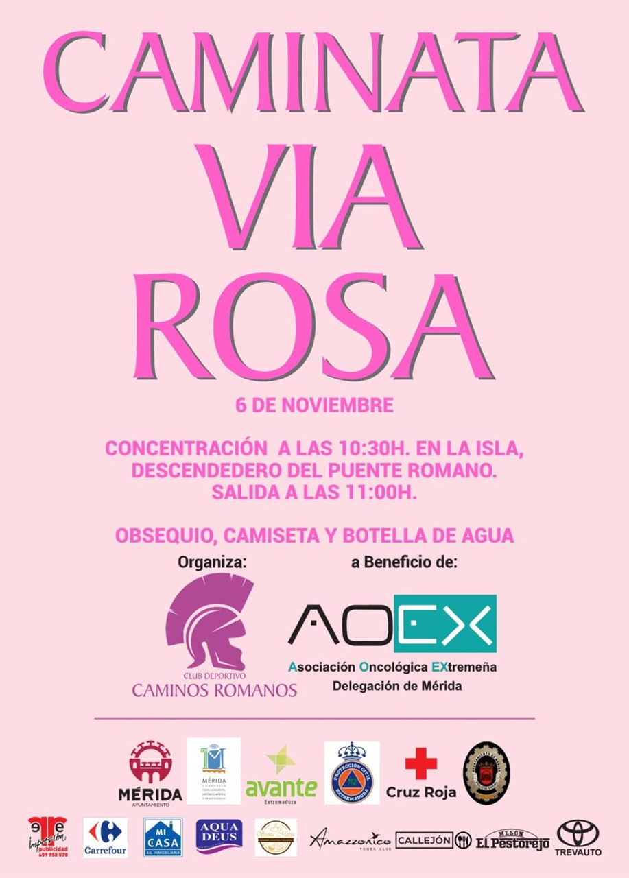 Mérida celebrará el próximo domingo 6 de noviembre (inicialmente prevista para el sábado 22 de octubre) la “Caminata Vía Rosa” para visibilizar el Cáncer de Mama con un recorrido monumental de 3,5 kilómetros con inicio en el descendedero del Puente Romano y llegada a la Plaza de España.