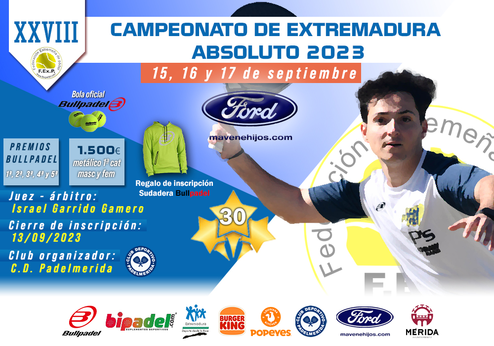 La XXVIII edición del Campeonato de Extremadura Absoluto de Pádel se disputará del 15 al 17 de septiembre en las instalaciones del Club Padelmerida. Los mejores jugadores extremeños lucharán por ser los campeones de Extremadura 2023.