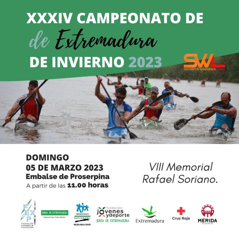 El domingo 5 de marzo de 2023 se celebra, en el Lago de Proserpina, el XXXIV Campeonato de Extremadura de Invierno – Memorial Rafael Soriano. Las pruebas comenzarán a las 11:00 horas. Organiza Federación Extremeña de Piragüismo