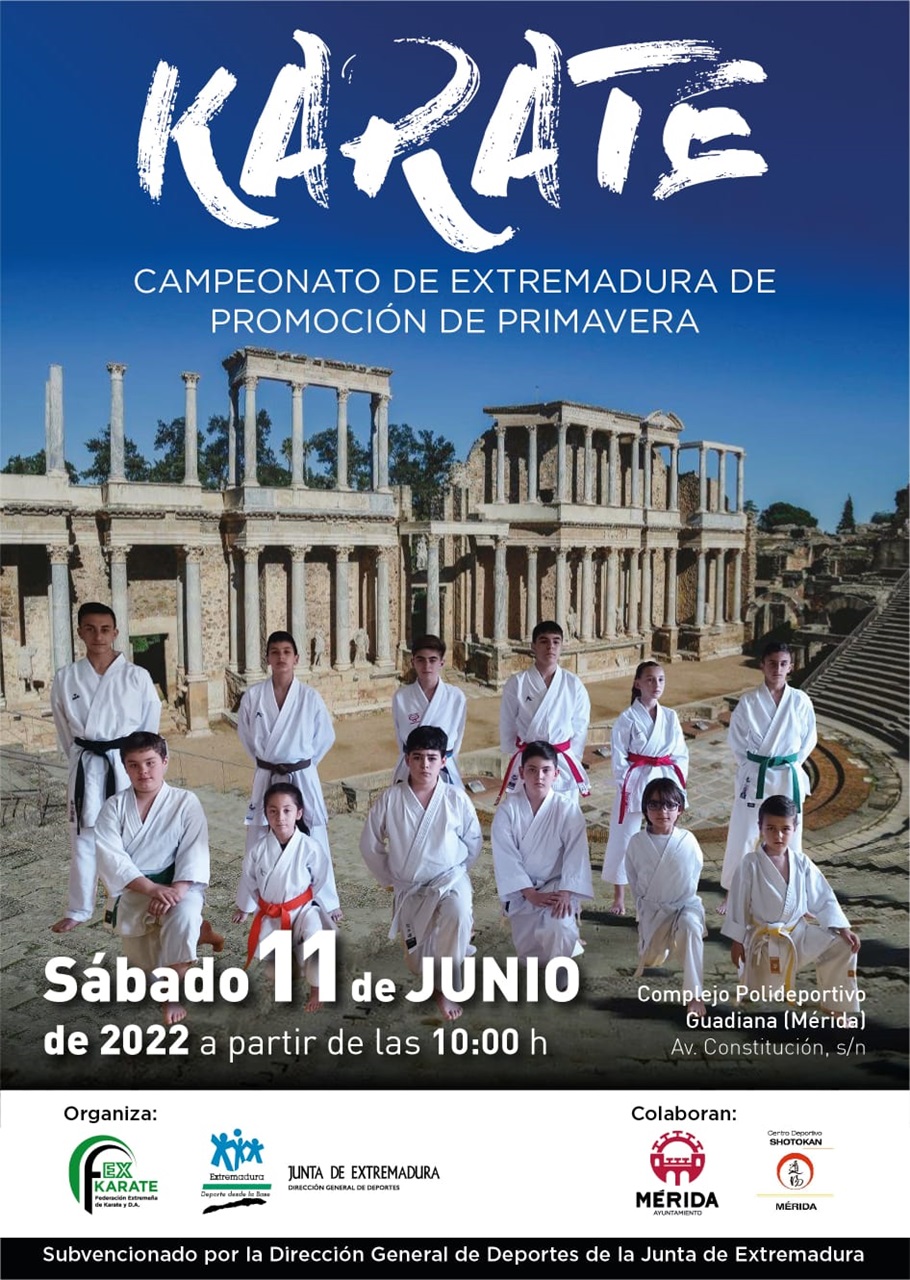La Federación Extremeña de Kárate organiza, el sábado 11 de junio, en el Complejo Polideportivo Guadiana, el Campeonato de Extremadura Promoción Primavera de Kárate con la participación de unos 365 karatekas en las categorías Prebenjamín, Benjamín, Alevín, Infantil y Cadete